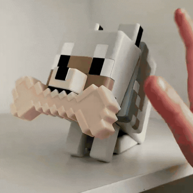 • Design em bloco 3D inspirado no Minecraft: lobo estilizado segurando um osso iluminado